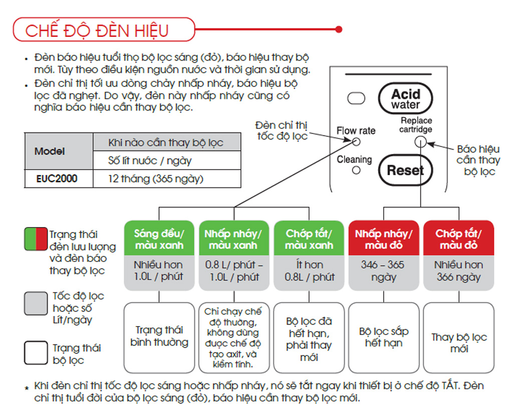 Đèn báo thay bộ lọc: Cảnh báo khi lõi lọc đến thời điểm cần thay thế, đảm bảo nước luôn sạch và an toàn.