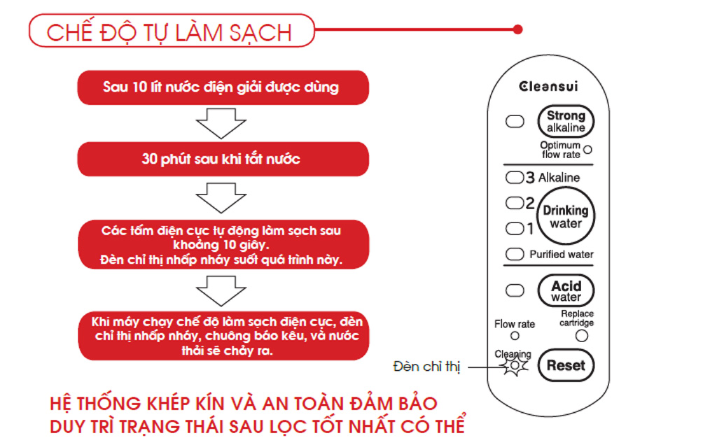 Ngoài ra, hệ thống còn được trang bị tính năng tự làm sạch điện cực, duy trì dòng điện ổn định, tự động rửa các tấm điện cực mà không làm giảm hiệu quả lọc, giúp nâng cao tuổi thọ và hiệu suất của thiết bị trong quá trình sử dụng nước ion kiềm hàng ngày.