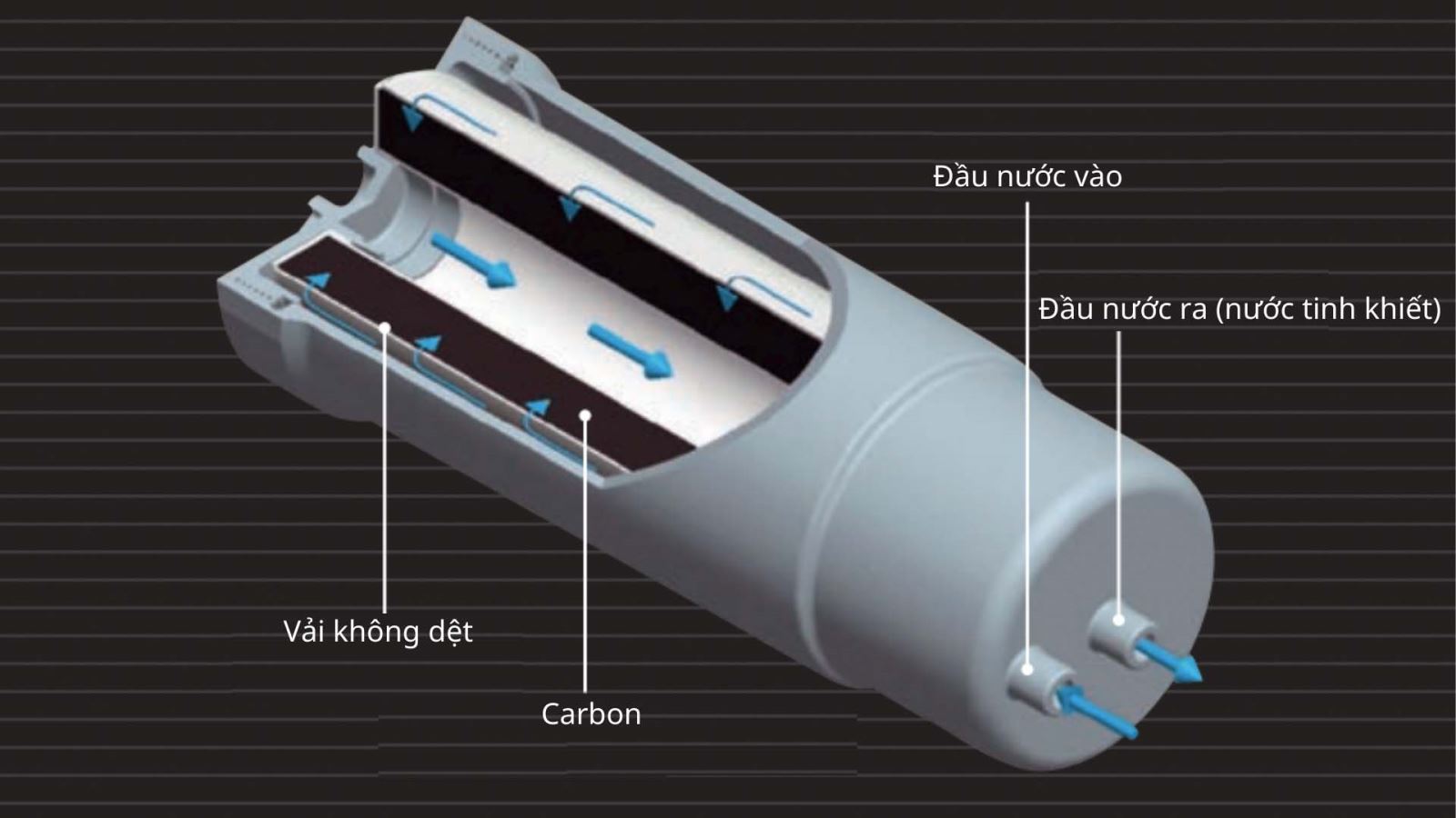 Nhờ hệ thống lọc hai lớp thông minh với lớp vải Non-Fabricated loại bỏ các hạt vật chất lớn và lớp Micro Carbon than hoạt tính siêu mịn, nước sau lọc không chỉ sạch mà vẫn giữ nguyên khoáng chất cần thiết và các ion kiềm tự nhiên, đặc biệt là canxi, kali, magie và natri.