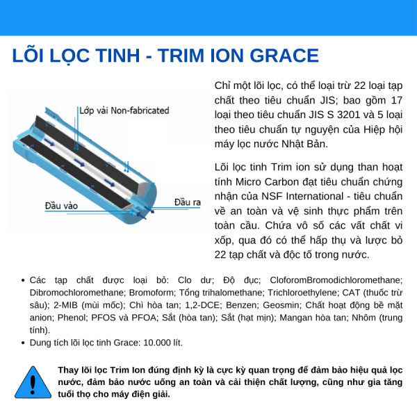 Với công nghệ điện giải tiên tiến, độ bền cao cùng thiết kế tinh tế, lõi lọc Trim Ion Grace thực sự là người bạn đồng hành đáng tin cậy cho mọi gia đình Việt.