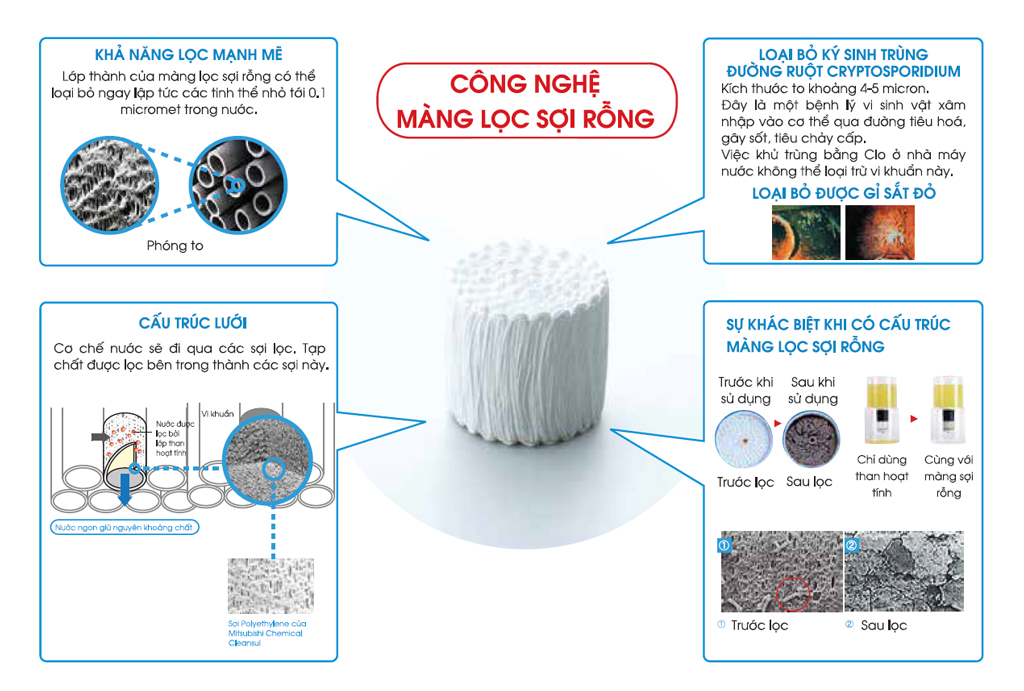 Với cam kết mang đến nguồn nước an toàn, tinh khiết và giàu khoáng chất, Cleansui đã nghiên cứu thành công và ứng dụng công nghệ màng lọc sợi rỗng tiên tiến vào các sản phẩm của mình.