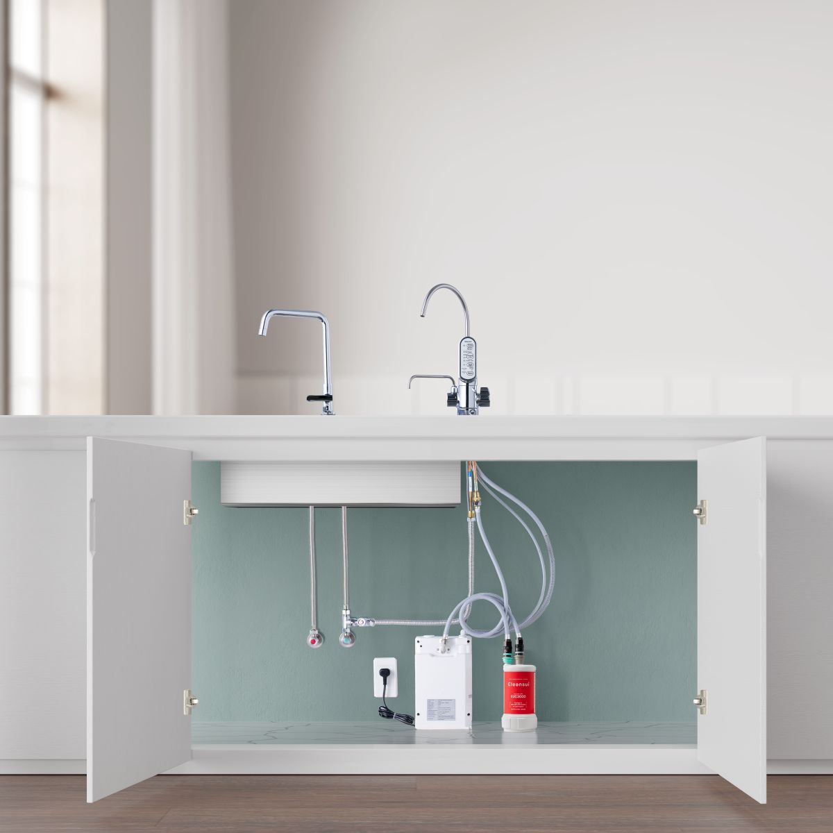 Các thiết bị lọc dưới bồn rửa Cleansui sử dụng bộ lọc EUC2000 và EUC3000 với công suất lọc lên đến 8.000 lít nước, giúp loại bỏ vi khuẩn, bụi bẩn và tạp chất, đồng thời giữ lại khoáng chất tự nhiên. Thiết kế gọn gàng dưới bồn rửa tối ưu không gian bếp, mang lại sự tiện lợi và thẩm mỹ cho căn bếp hiện đại.