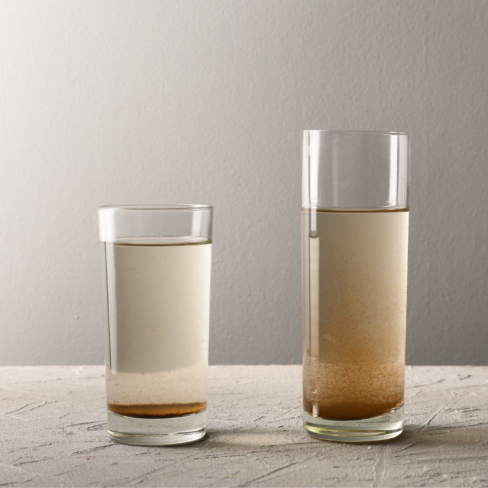 Cặn lắng và váng: Sau một thời gian để yên hoặc đun sôi, nước có thể tạo ra cặn đỏ nâu hoặc váng nâu cam. Các cặn này dễ bám trên thành ấm đun, bồn rửa hoặc các thiết bị vệ sinh, để lại những vệt màu khó tẩy sạch.