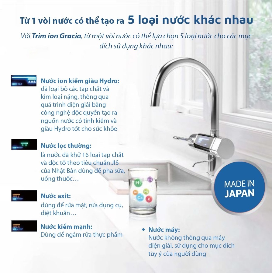 Máy lọc nước Trim Ion Gracia có khả năng tạo ra 5 chế độ nước đáp ứng mọi nhu cầu sinh hoạt và ăn uống trong gia đình, trong đó đặc biệt là 3 mức nước uống ion kiềm (Alkaline 1 – 2 – 3):